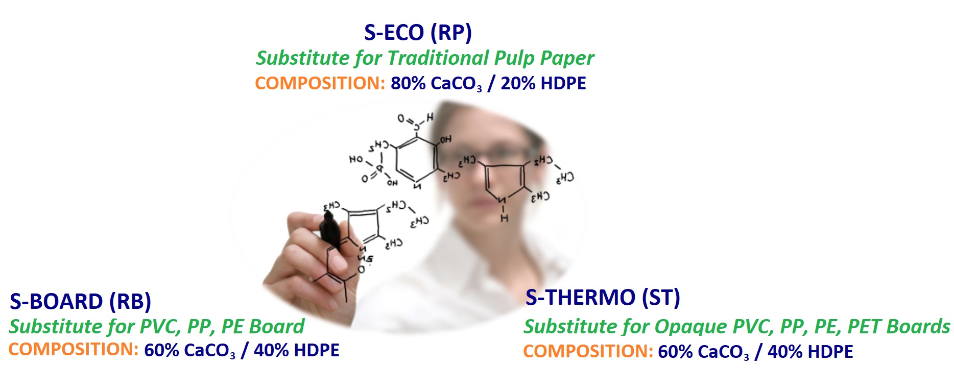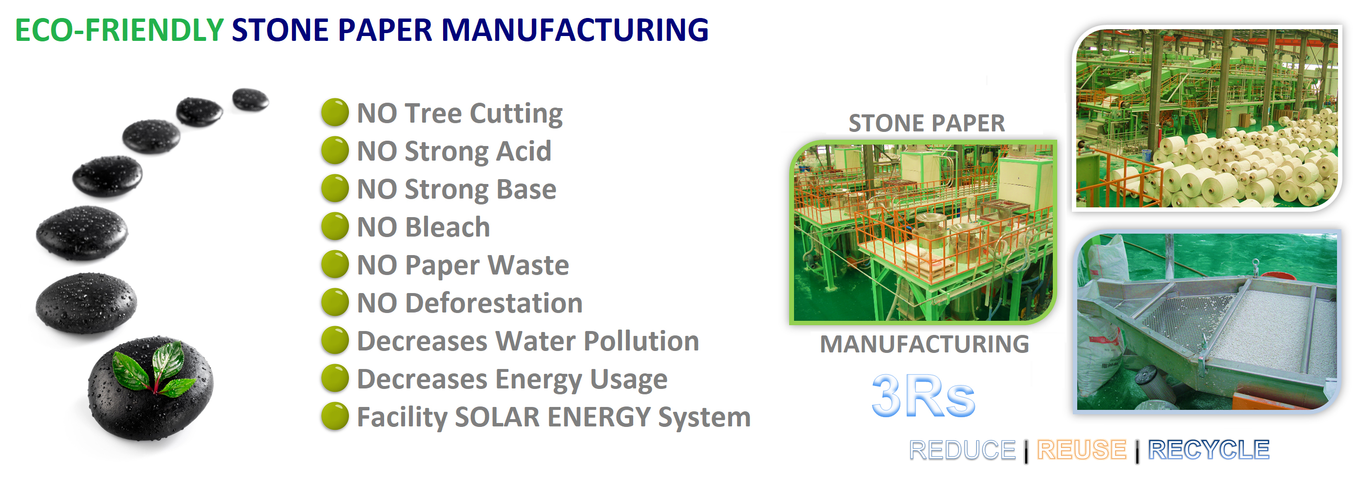 Proprietary machinery utilizing patented technology binds the Calcium Carbonate to HDPE in varying consistencies in order to make Stone Pellets which are further processed in the factory to ultimately make Stone Paper. All paper waste at the end of the Stone Paper manufacturing life-cycle is collected and recycled back into Stone Pellets which are again utilized in the Stone Paper manufacturing process.